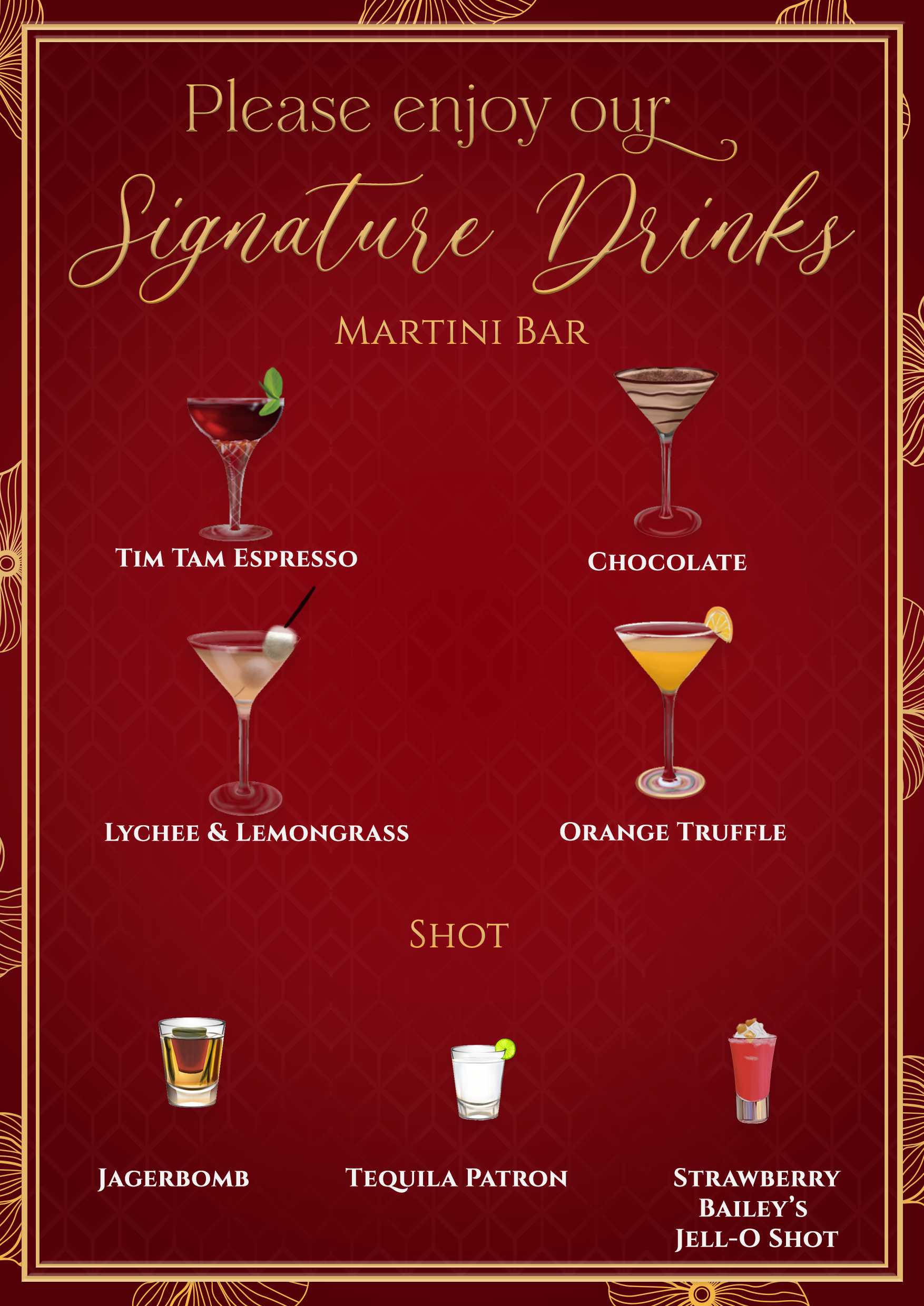 Welcome to our wedding bar! Sip, savor, and celebrate with a curated selection of handcrafted cocktails, fine wines, and refreshing non-alcoholic options. Our bar menu is designed to reflect our favorite flavors and shared memories — from classic sips to personalized pours.